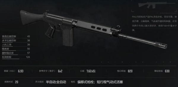 1、FAL枪械重量为6.93kg,占据背包尺寸格子为6×2,适合携带但需注意背包空间管理。