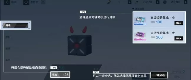 对辅助机进行升级须要消耗对应的“支援经验集成”,指挥官可利用【一键全选】功能,优先选取品质低的