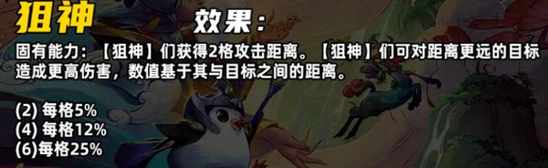 2、根据与目标的距离,狙神英雄可以获得额外的伤害加成,这一特性在2、4、6羁绊激活时分别提供5%、12%和25%的每格伤害加成。