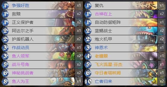 2、玩法介绍:早期利用救赎奥秘与圣盾/复生怪赖场,5费拍下芬杰/战斗号角进行超展开。对阵快攻6费准时神秘挑战者大体上就游戏结束了,对控制卡组须要靠亡者归来斩杀。