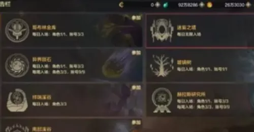 2、在每日任务区域,寻找并进入名为迷妄之塔的副本。