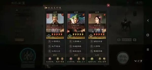 1、阵容配置:由程昱、姜维和蔡文姬组成的三势骑兵,程昱携带士别三日,姜维携带杯蛇,蔡文姬携带三势阵,这一配置在开荒阶段非常稳定。