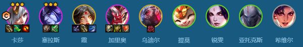 1、卡莎:作为阵容的核心输出,卡莎的技能爆发高且自带位移,非常适合作为主C。