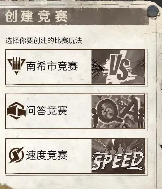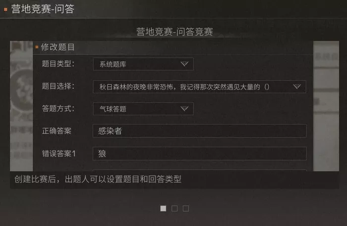 幸存者成功创建问答竞赛后,创办者可指定人员从营地行会提供的题库中挑选最多20道题目,并决定每道题的答题方式和惩罚方式。