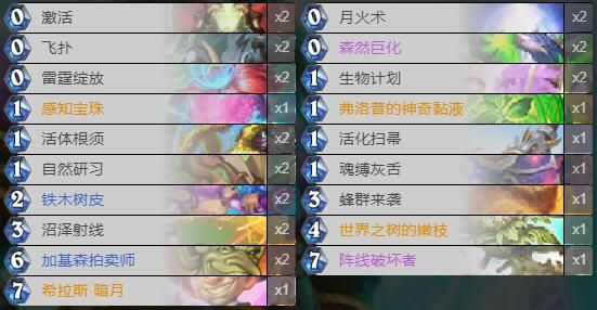 这套卡组主要是受到目前大热的奇迹德影响,把换家平衡组件改成千甲斩杀组件。说是千甲,但是本套卡组最多只要80点斩杀能力,但应对大多数中慢的卡组都是足够的了。主要思路是7费启动(有生物计划可以5费启动),通过加基森大量过牌过到双刀 千甲斩杀组件。第一回合提刀,第二回合阵线破坏者 粘液 宝珠 蜂群 大地之鳞 灰舌 暗月 扫帚。这个操作是可以在一回合内打出的,加基森刷牌如果手里有根须 月火 粘液一般是可以直接启动的。这套卡组相较于换家不用过空牌库,然而不能带吹笛人检索加基森,构筑还有优化空间。推荐喜好奇迹德的玩家尝试。