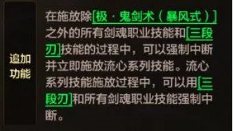 【25级】流心:狂(被动):在施放除【极鬼剑术暴风式】之外的所有剑魂职业技能和基础技能【三段刃】的过程中,可以强制中断并立即施放流心系列技能。流心系列技能施放过程中,可以用【三段刃】和所有剑魂职业技能强制中断。