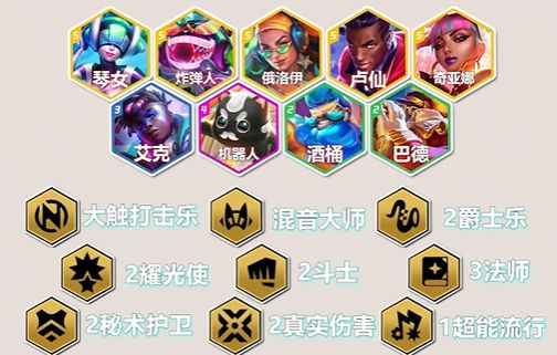 2、羁绊组建:1大触打击乐、1混音大师、2爵士乐、2耀光使、2斗士、3法师、2秘术护卫、2真实伤害、1超能流行。