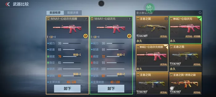 在满精通的状态下,M4A1-心动次元的精度为72,稳定为55,而同样满精通的情况下,M4A1-心动次元觉醒的精度为76,稳定为61。