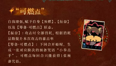 3、神秘术-可燃点:自身会有三个状态,主要能够打出暴击伤害,包括预燃、振奋以及筹备·可燃点。