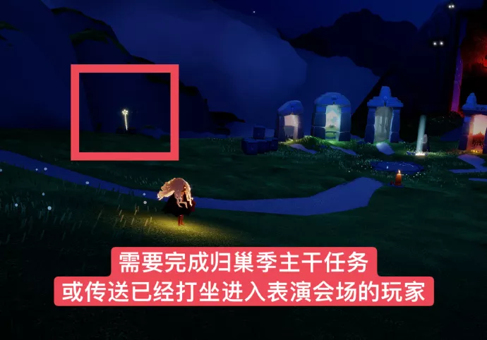 完成归巢季主干任务后在云巢七大地图传送门左边雪花造型的烟花杖处打坐参与