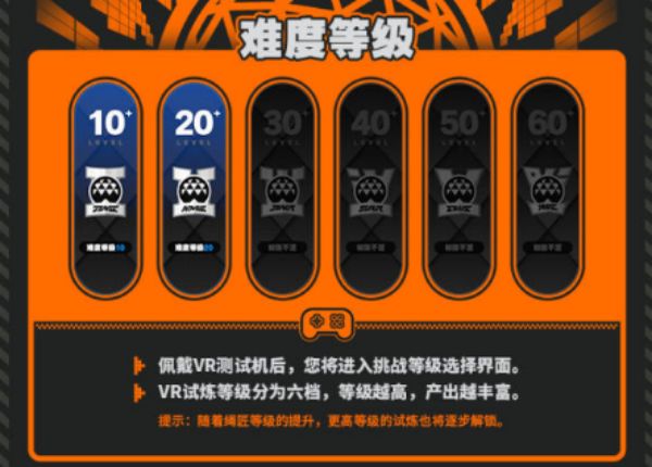 3、佩戴VR测试机后,玩家可以选择试炼的难度等级,共有六档难度可供选择。难度越高,挑战越大,但相应的奖励也会更加丰厚。