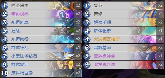2、玩法介绍:这套卡组采用了狂乱作为早期解场手段,同时仅携带大法师戈霍恩之血和废料场巨像五张随从,增强了对抗慢速卡组的能力。此外,卡组还加入了亚煞极神像和复苏,以提高精华的容错率和对抗快攻的能力。