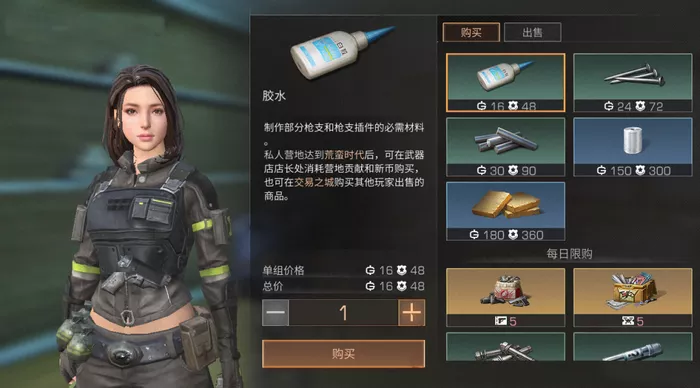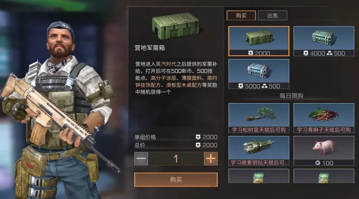 也可以在营地商人夏冬凉处购买高级补给箱、特级补给箱和营地军需箱,打开可取得高分子涂层等特殊材料和新币等奖励,通过出售特殊材料可以取得大量金条。