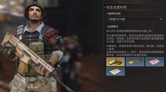幸存者每日可以在营地公告牌旁边的保安官英格雷处选取营地巡逻任务,在营地的不一样地方击倒敌人。