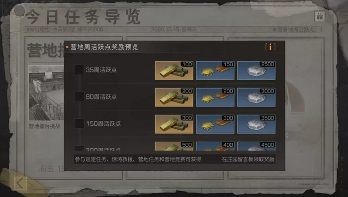 幸存者每天参与营地巡逻、营地竞赛、军事演习和营地任务可取得营地周活跃点,每种玩法每人每日可取得1点周活跃点,营地周活跃点按周累计,累计到一定数量后可以取得营地贡献值等奖励,奖励在庄园留言版处领取。