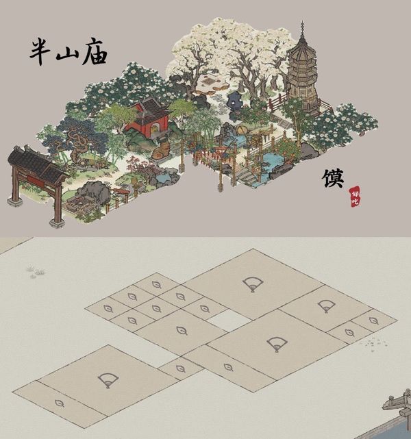 2、布局二:包含桂花树、湖心亭、人工湖等多种元素,半山娘娘庙的春笋掉率虽低,但整体布局丰富,能有效提升游戏体验。