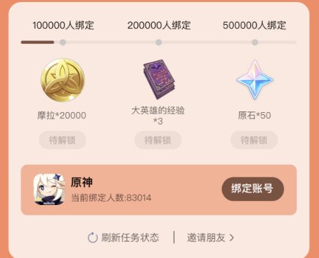 2、当里程碑进度达到10万、20万、50万时,可分别解锁摩拉20000、大英雄的经验3、原石*50等奖励,奖励将直接发放至游戏邮箱,请在30天内领取。