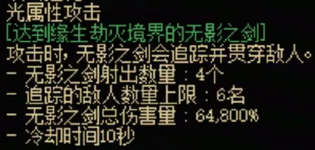 独特的特效武器,一旦冷却完毕,角色模型背部将显现一把小型短剑,短剑能自动追踪并攻击敌人,附带光芒属性。