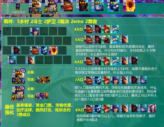 阵容羁绊:5乡村2斗士2护卫2裁决2emo2舞者