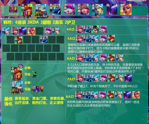 阵容羁绊:6音浪 3KDA 3超粉 2真实 2护卫