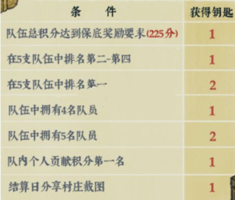 虽然有些队伍对积分没有严格要求,但为了确保能够达到保底奖励,建议加入实力较强的队伍。此外,个人积分在队内排名第一是获取最多钥匙的关键。与队员保持良好的沟通,确保积分最大化。