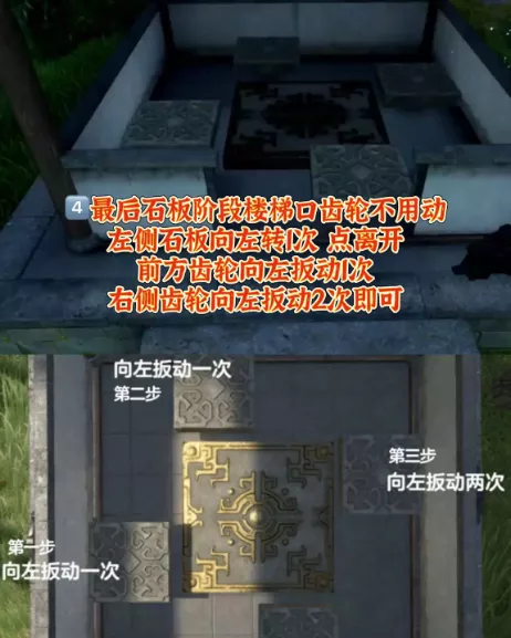 4、最后石板阶段楼梯口齿轮不用动 左侧石板向左转1次 点离开 前面齿轮向左扳动1次 右侧齿轮向左扳动2次即可。