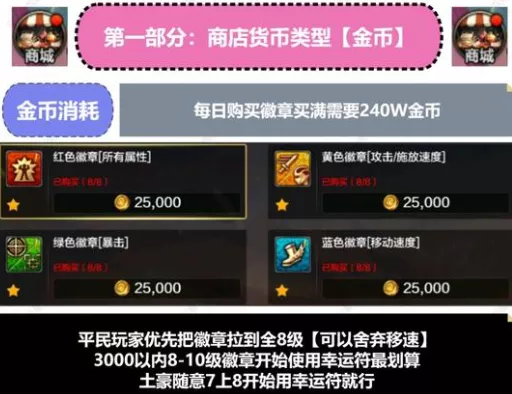 1、金币:可以用来购买红、黄、绿和蓝色徽章。