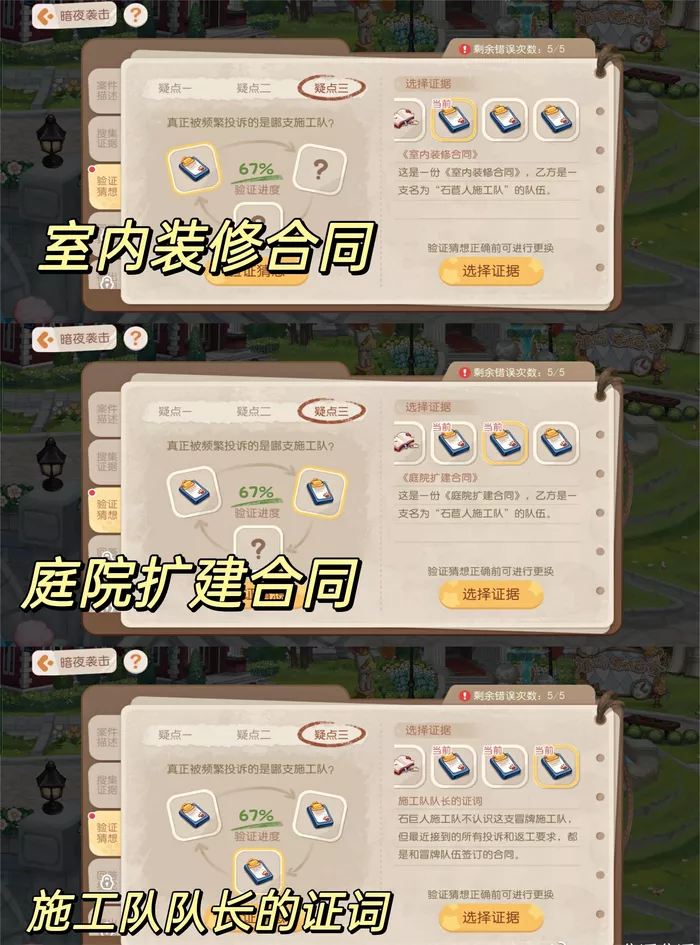 疑点3: 室内装修合同、庭院扩建合同、施工队队长的证词。