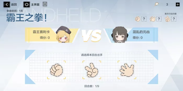 天眼在游戏前一定要打开,若当前回合数大于预测行动数,则我方全出克制敌方的行动,这样就能保证拿到低保分,只要运气不差就能获胜。由于最后关七实的行动是无从被天眼预测的,因此建议按照“拳头、剪刀、布”的顺序出招,即可拿到3分。