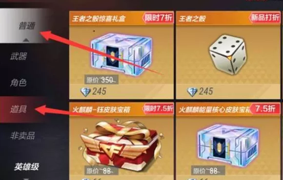 2、点击进去商城界面后,点击左边的普通,跟着下拉框出现几个选项点击道具。