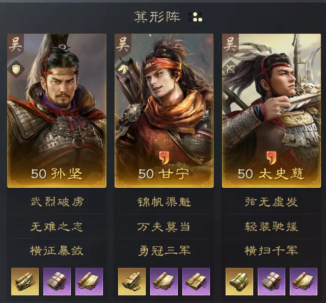 阵容推荐:甘宁选择此阵容的话,专属韬略要选择《劫术》,这本韬略每回合有30%几率让甘宁多发动一次普攻。如果运气好发动了本次普攻,且本轮的普攻触发了连击效果的话,一回合打三次普攻后就会触发勇冠三军的额外伤害,且这三次普攻都能够通过万夫莫当将输出扩大。