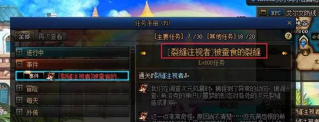 2、随即,在菜单中选取“事件”,并接受“逐渐消逝的裂隙”这一任务。