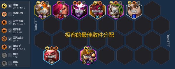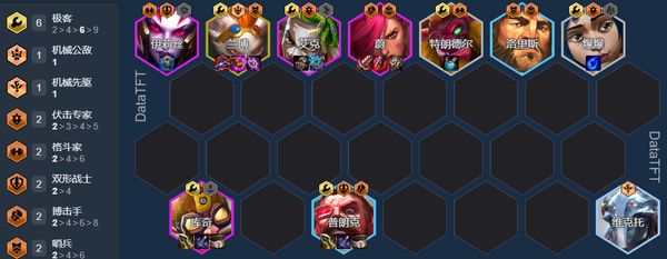 推荐阵容为6极客、3伏击、2格斗、2双形,核心英雄包括爆爆、特朗德尔、普朗克、伊莉丝、艾克、库奇、金克丝、兰博和梅尔。八级时可考虑加入蔚以增强阵容的灵活性。