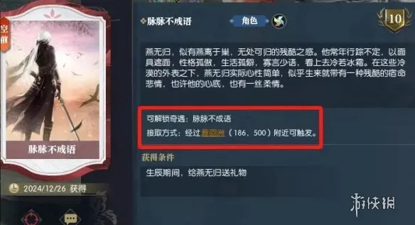 1、找到燕无归,给他赠送礼物,来到雁回洲(186,500)附近会触发脉脉不成语奇遇。