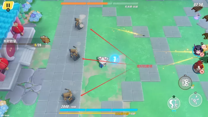 完成方式:在挑战过程中,拾取敌人掉落的木材,与基座交互,建造三个箭塔。