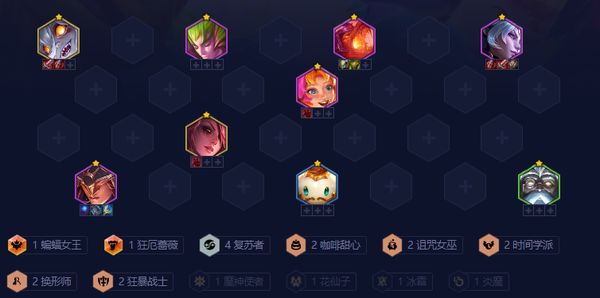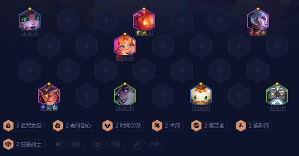 羁绊:2复苏者、2咖啡甜心、2诅咒女巫、2术师、2换形师、2狂暴战士。