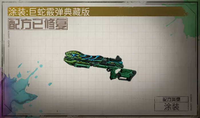 巨蛇霰弹枪典藏版,外观透着凛冽的绿光,华丽的涂装带来攻击力 3的效果,在射击状态下增强20%移速,枪膛获得精细打磨,使单次射击的分裂弹片数量增强至7片。