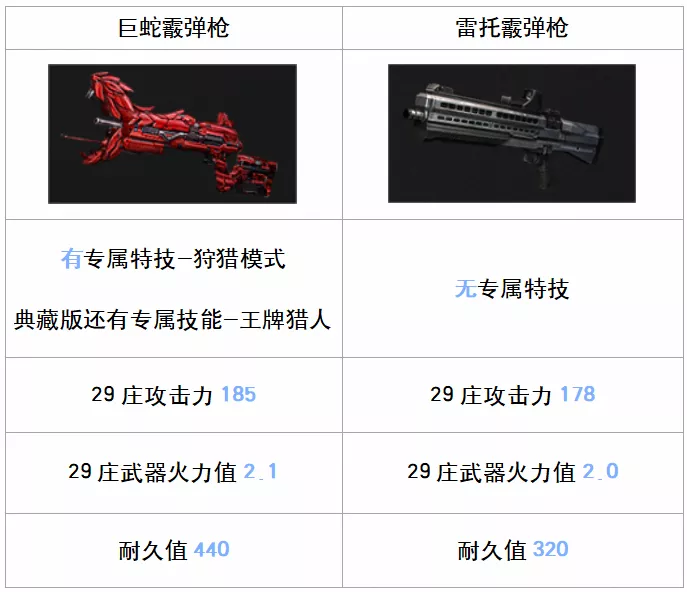 对比可行看出巨蛇霰弹枪的专属特技为战斗增添不多威力,雷托霰弹枪虽无特技,但也极为强势。