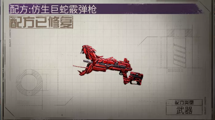 配方:仿生巨蛇霰弹枪须要使用修复材料进行修复,幸存者们可使用配方:雷托霰弹枪,或是雷托霰弹枪制作次数进行配方的修复。