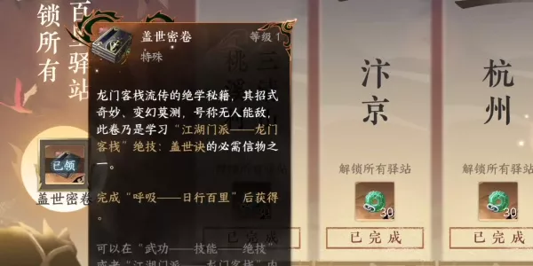 4、若要获取至关重要的盖世密卷,需在游戏内的“日行千里”功能板块中,悉数解锁隐藏于各地的地图驿站,当所有驿站都被揭开神秘面纱时,盖世密卷即唾手可得。
