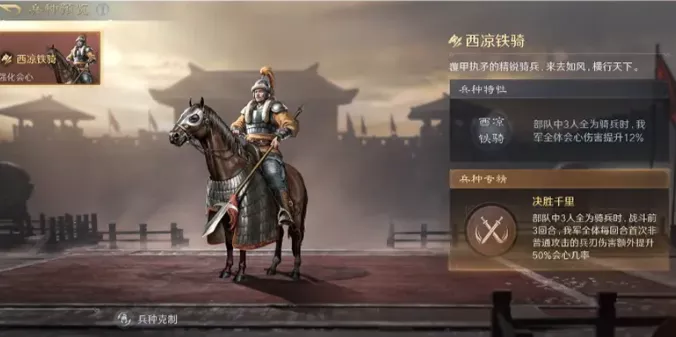 兵种解读:西凉铁骑适配的武将为与爆发兵刃伤害挂钩的武将,且最好是搭配单段兵刃伤害,这样搭配兵种专精给予的会心摄率可行在战斗前期造成高数会心伤害。